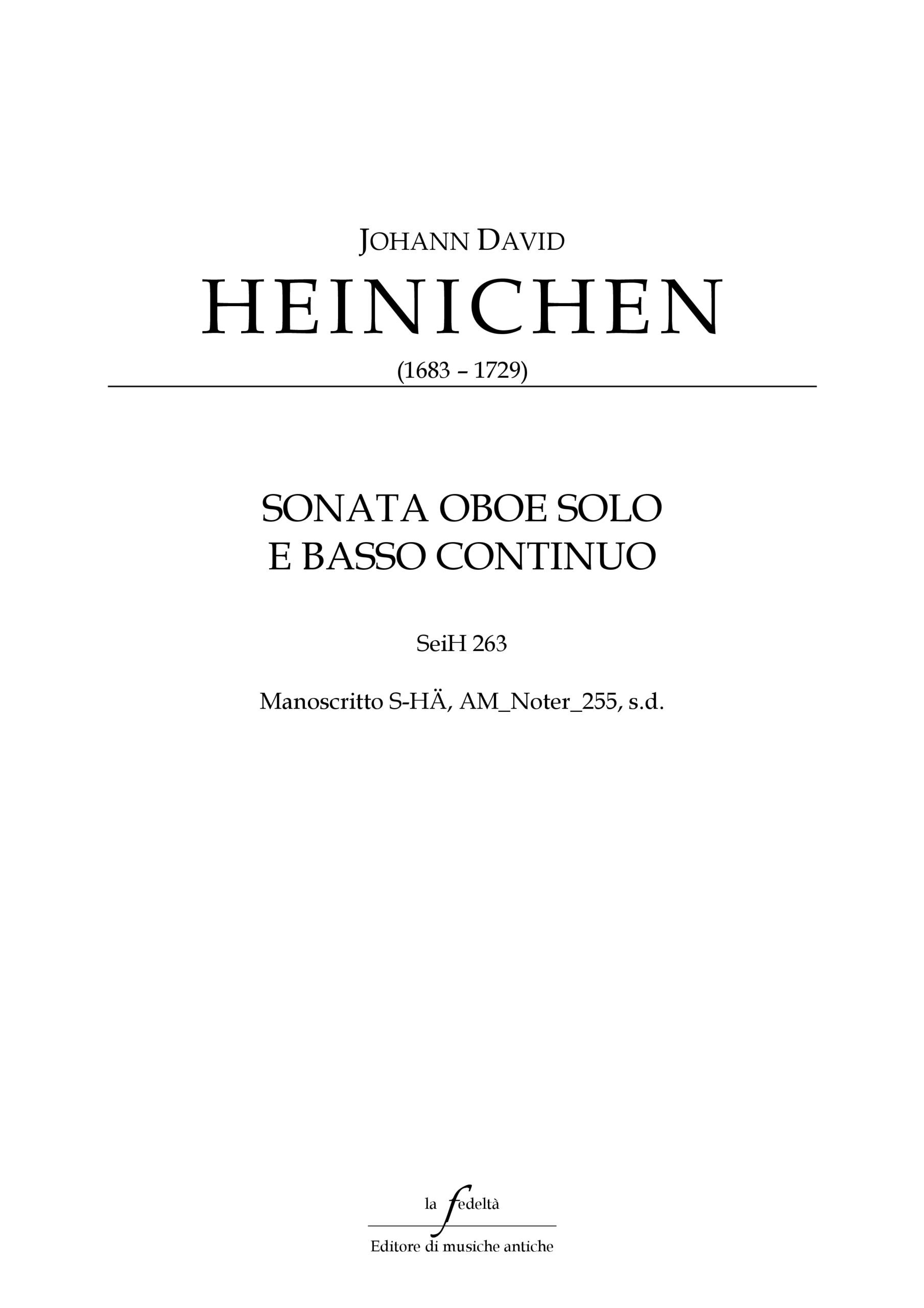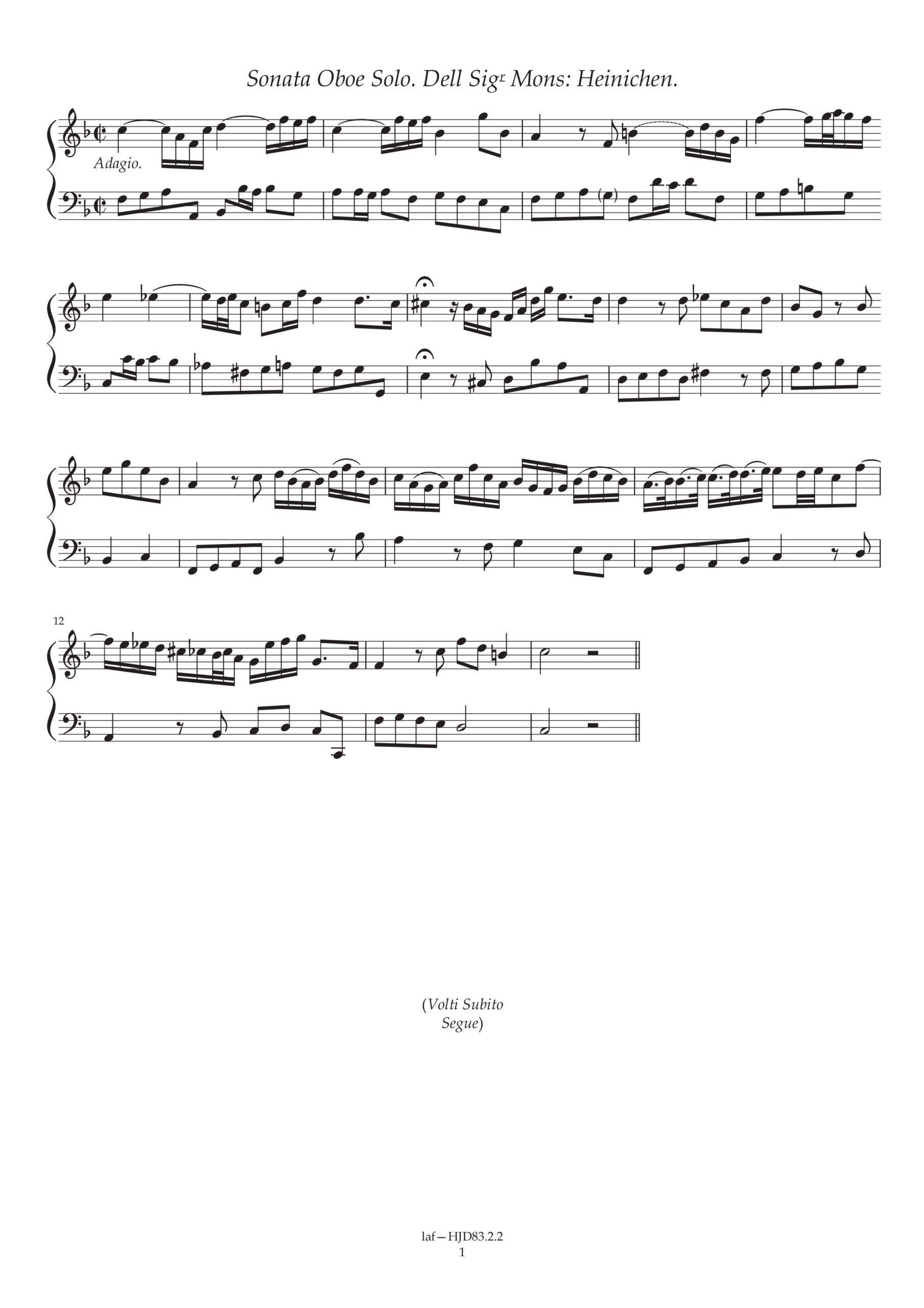 Johann David HEINICHEN a écrit beaucoup de musique pour le hautbois, mais parmi toute cette musique, assez peu pour hautbois solo (avec basse continue). La présente sonate fait partie de ces pièces pour hautbois et basse continue. Elle exploite habilement l'ensemble de l'ambitus usuel du hautbois, et propose dans ses quatre mouvements de déployer tour à tour affects et agilité technique.