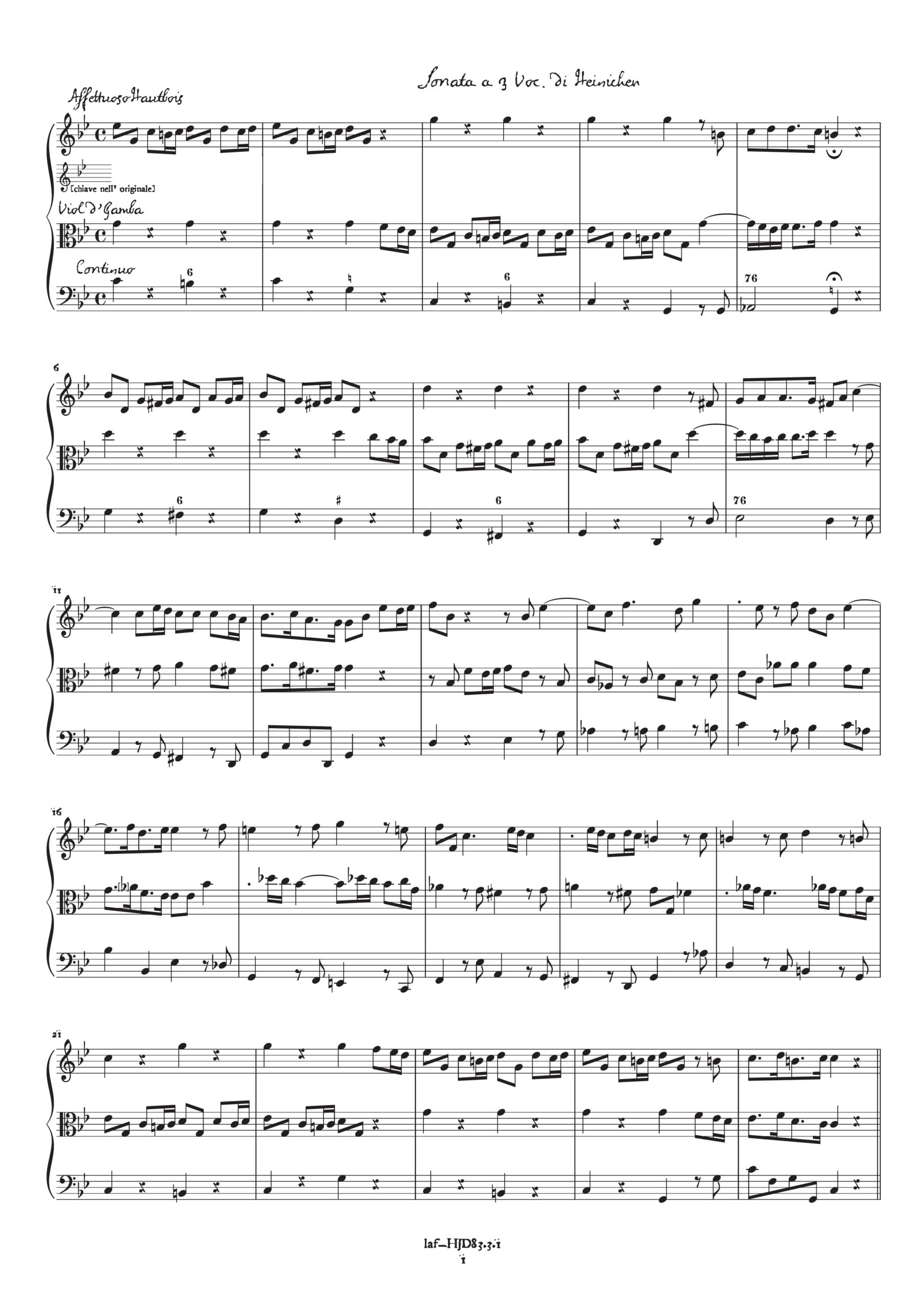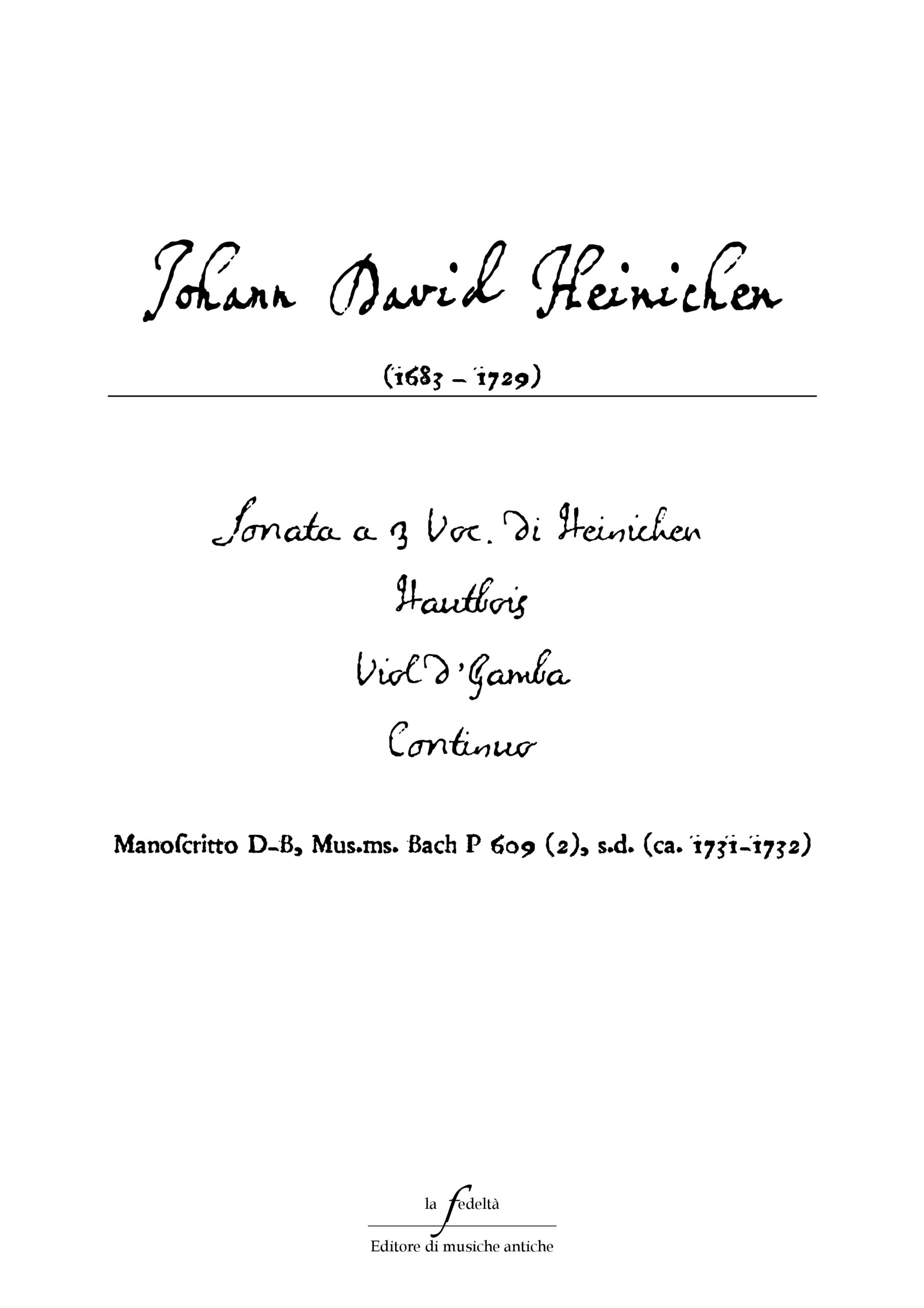 La plupart des sonates en trio associent deux dessus à une basse continue, plus rarement un dessus, un instrument de basse et une basse continue. Heinichen opte ici pour une combinaison somme toute particulièrement peu rencontrée en associant au hautbois une viole de gambe (avec l'accompagnement d'une basse continue naturellement). L'originalité de cette association repose sur le fait que la partie de viole peut être jouée sur un ténor, ou – plus saisissant encore – sur une basse de viole, dans son registre (très) aigu. Il s'agit là d'une pièce remarquable à plus d'un titre.